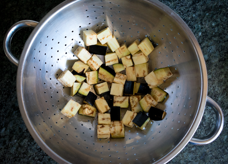 Cortar la berenjena en cubos de 2 a 3 cms y colocarlos en un colador. Espolvorear con sal y dejar reposar en el lavabo durante 20 minutos, para permitir que "sude".
