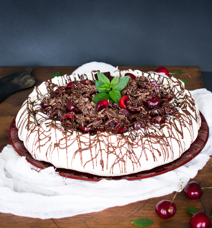Hoy te quiero compartir otra versión de uno de mis postres favorito, la pavlova selva negra. Un delicioso merengue con cerezas y chocolate, con los mismos sabores del clásico pastel selva negra pero en una presentación muy original! Este merengue con cerezas es ideal para regalar o para alguna comida especial.