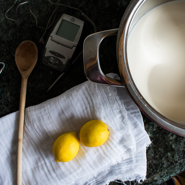En una cacerola alta y profunda, calentar la leche junto con la crema hasta que llegue a 81ºC. Apagar el fuego, agregar el jugo de limón, cubrir y dejar reposar sin mover durante 15 minutos. Verás una separación clara del suero y el queso cuajado en trozos.