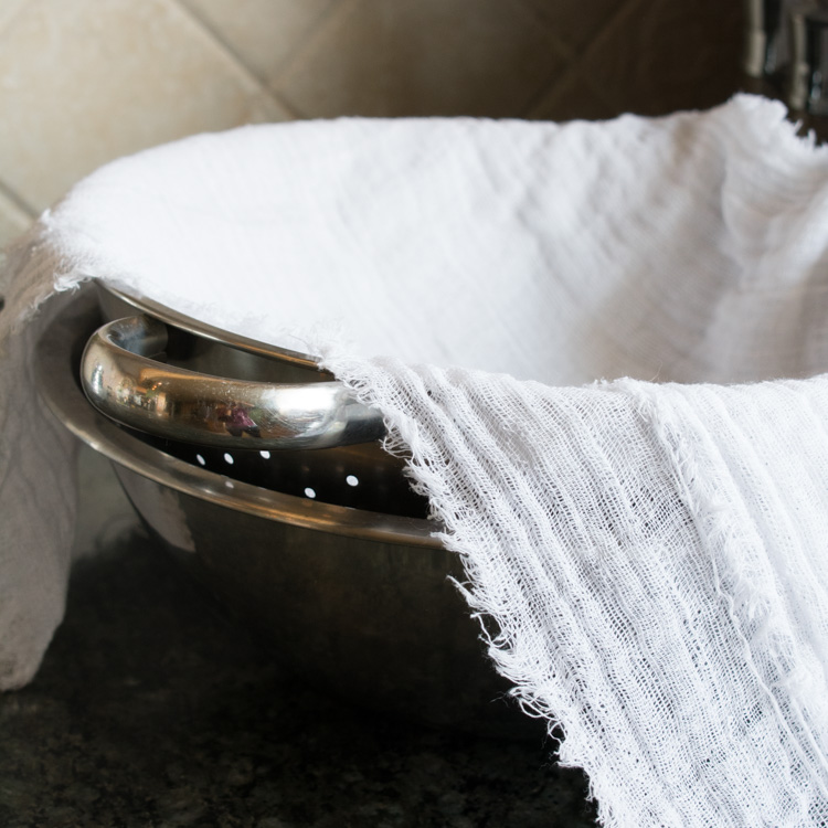 Preparar un colador con dos capas de tela para queso o paño delgado (ver fotos) Colocar el colador sobre un tazón profundo si se quiere rescatar el suero, o directamente en el lavabo si no es así.