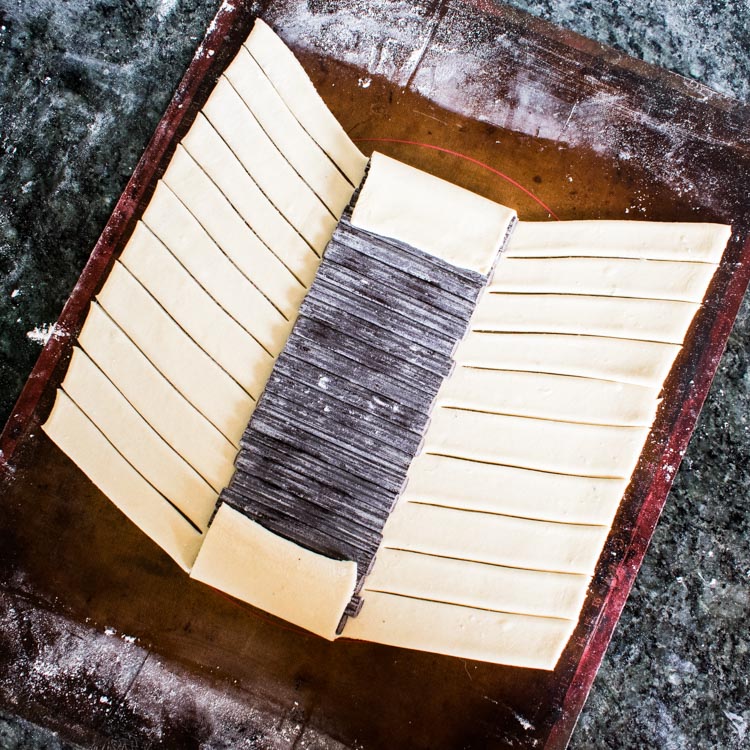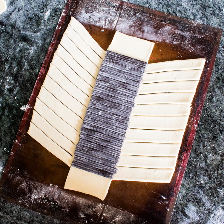 Enharinar la superficie de trabajo y con ayuda del rodillo, estirar la hoja de hojaldre hasta obtener un rectángulo largo de aprox 3-4mm de grosor. Transferir a una charola para hornear con papel encerado on un tapete de silicón.